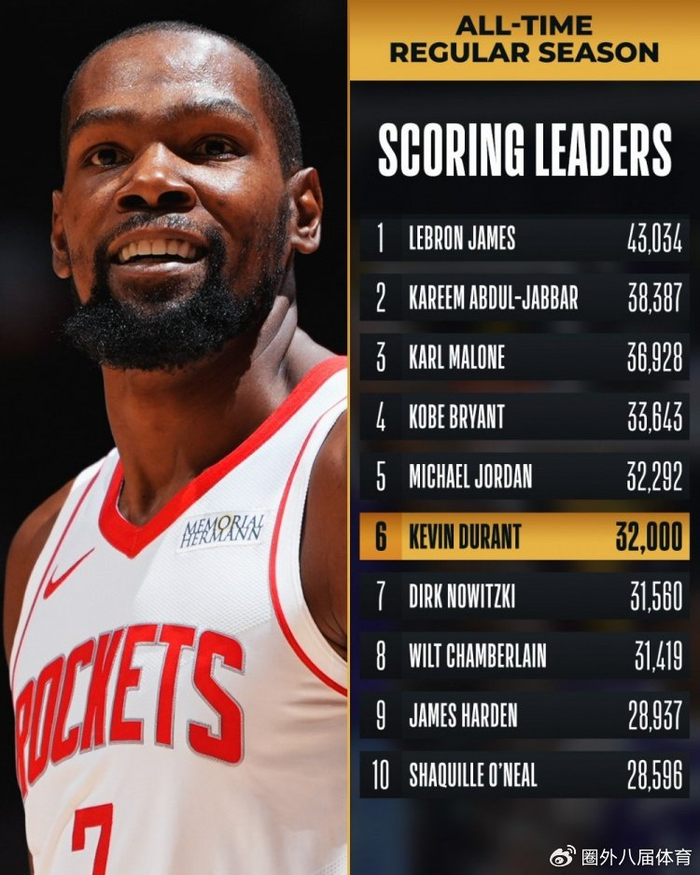 杜兰特火箭战胜魔术的比赛中狂砍40分,职业生涯总得分突破32000分大关,目前排名历史得分榜第六位,现役排名第二位仅次于詹姆斯。