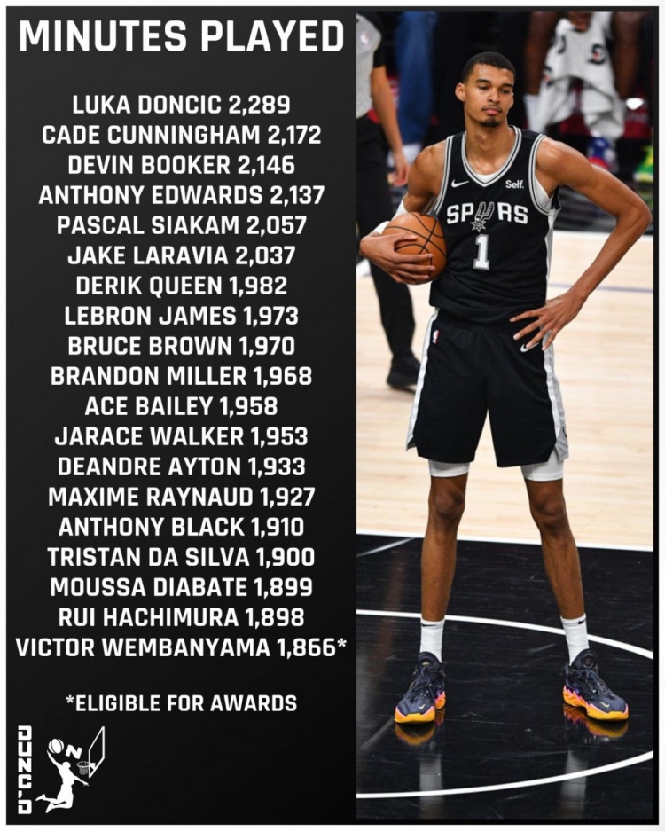 美记Nate Duncan列出了本赛季出场时间比文班亚马多,但因65场规则没有评奖资格的球员,按出场时间依次是东契奇、坎宁安、布克、爱德华兹、西亚卡姆、拉拉维亚、奎因、詹姆斯、布鲁斯·布朗、布兰登·米勒、贝利、贾雷斯·沃克、艾顿、雷诺、布莱克、席尔瓦、迪亚巴特、八村塁。